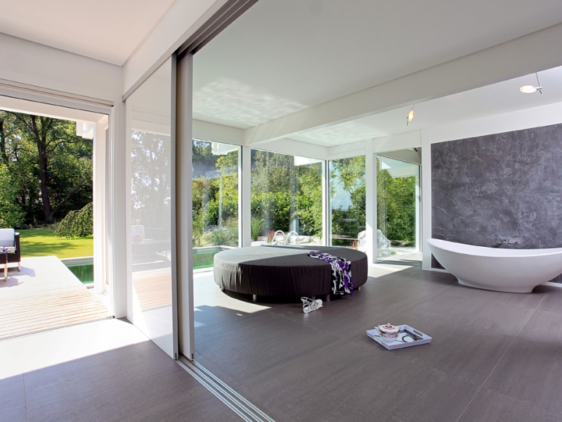 Schwellenlos gleiten die Schiebetüren und öffnen das Haus in den warmen Jahreszeiten der Sonne und dem Licht. Der perfekt auf diesen Entwurf abgestimmte Garten gibt zu jeder Jahreszeit das Gefühl des verdienten Urlaubs.
