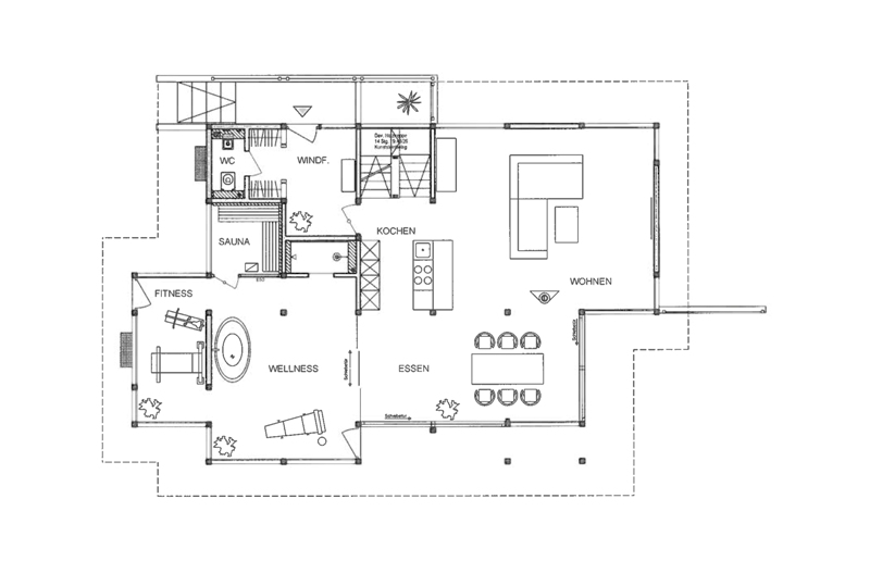 Die Fitnessgeräte werden optisch ein wenig separiert, damit kein Zugzwang aufkommt. Durch einen Hausvorsprung und einer eigenen Abschleppung zusätzlich betont, bildet der Wellnesnereich fast schon das eigentliche Herz des Hauses. Die Vor- und Rücksprünge ermöglichen die Erweiterungen der Sichtachsen und maximieren die unmittelbare Anbindung an die Natur.